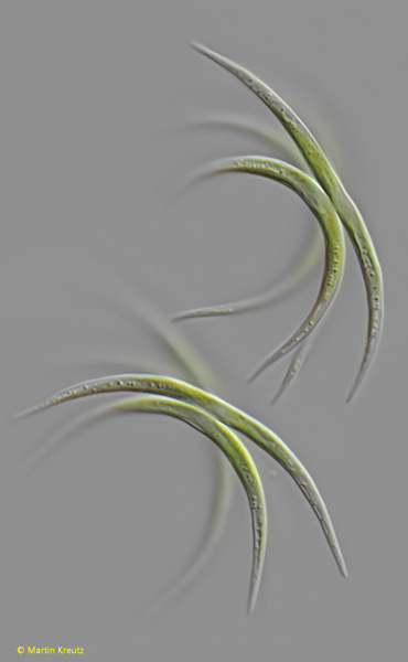 My interest in microscopic life forms in freshwater extends from the prokaryotes to the metazoans, whereby I have a preference for the ciliates, which form a species-rich and extraordinarily diverse group. Over the years I could assemble a rich collection, which I would like to show here, appropriately processed. Most of the microphotos shown here were taken on an Olympus BX 50 microscope equipped with DIC and microflash. Only with this equipment it is possible to photograph fast moving or low contrast objects. It also requires a certain amount of experience how to best prepare the living objects to get meaningful images. Finally, the introduction of digital cameras enabled a new quality, as it was possible to check the results immediately.