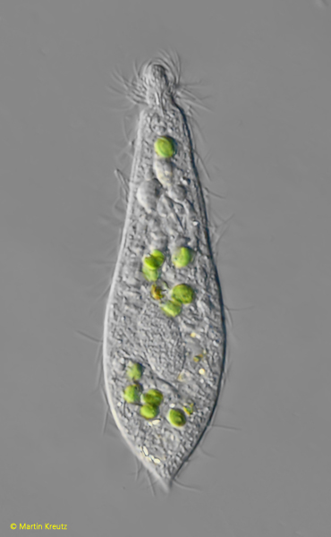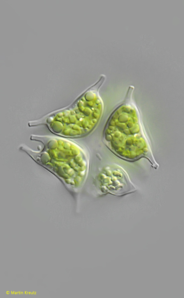 The specimens in my population were 75–122 µm long, which fits well with Matvienk’s length data (96–133 µm). The smallest specimen with 75 µm also had three coils, but was completely filled with paramylon grains, which made the specimen appear rather clumsy (s. fig. 5 a-d). I was almost always able to identify phagocytized, small algae in the other specimens (s. fig. 3 c). Larger paramylon grains were often found in the anterior third, while clusters of very small paramylon grains were found in the posterior third. The nucleus was in the anterior third or in the center of the body. The striation of the pellicle can only be seen at high magnification between the the coils.