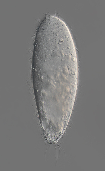 Heteronema trispira is slender spindle-shaped and has three characteristic coils which are turned counterclockwise. The anterior end is snout-like and the posterior end is tapered and rounded, as described and drawn by Matvienko. In my population, however, there are some deviations from Matvienko’s description. In my specimens, the leading (swimming) flagellum was only about half as long as the body and the trailing flagellum only slightly shorter. Matvienk describes them as body-length. I could not find the rod-shaped organelle described by Matvienk in the area of the mouth opening in any of the specimens in my population.