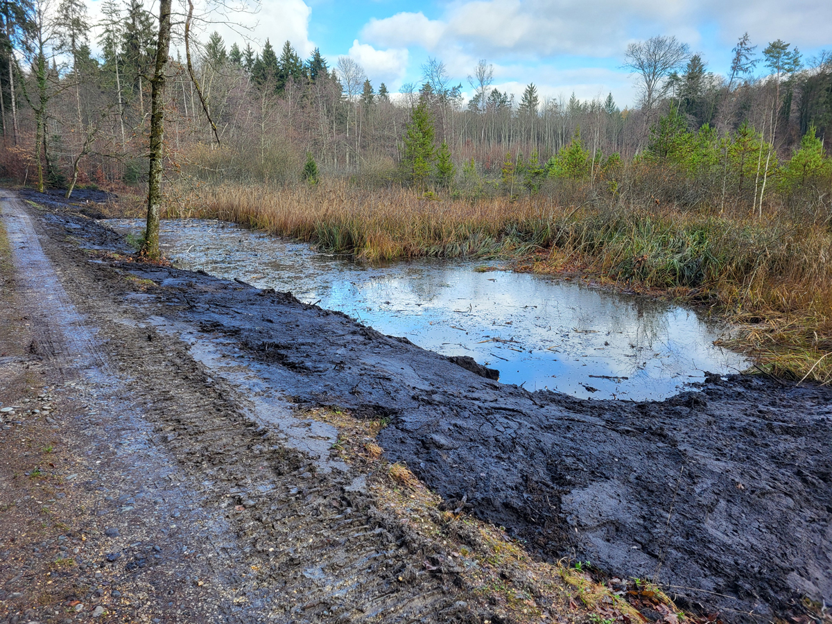 After the pine trees were cut down in the winter of 2010, a new pond was created with an excavator, pond 6 was deepened, and pond 2 was widened. This was a serious intervention in the ecosystem and it was feared that the Simmelried would lose its (microscopic) biodiversity as a result. Fortunately, however, the existing thick layer of mud in pond 2 was not dredged along with it. Thus, a kind of „starter culture“ was preserved from where the newly created habitat could be colonized.